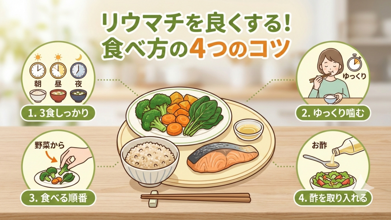 血糖値を急上昇させない食べ方は、リウマチの症状改善に大きく貢献します。